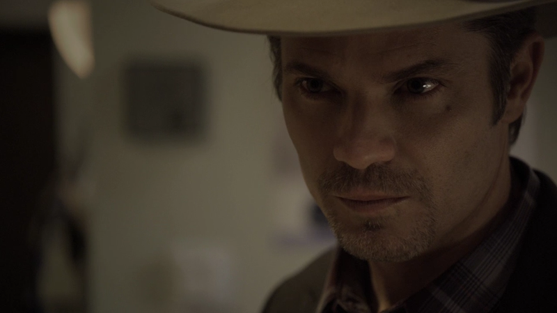 Le rôle de Raylan Givens qu’il interprète magistralement est un personnage de western à l’ancienne dans un univers moderne (bien que le Kentucky soit un peu sauvage). La réussite de son travail tient au rythme qui va d’un extrême à l’autre, d’un naturel assez lent, il peut néanmoins dégainer le plus vite. Et puis il y a ce regard partie intégrante, là aussi, des classiques du duel au western, qui le met bien en valeurs (voir photo).